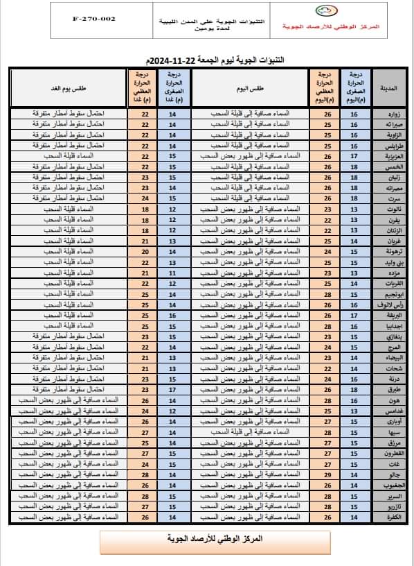 أفاد مركز الأرصاد الجوية بتكاثر السحب من حين لآخر على بعض مناطق شمال ليبيا مع فرصة لسقوط أمطار خفيفة هذا اليوم على المنطقة الممتدة من بنغازي إلى الجبل الأخضر.