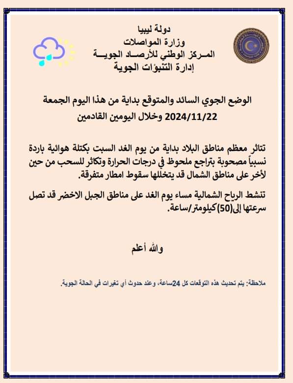 أفاد مركز الأرصاد الجوية بتكاثر السحب من حين لآخر على بعض مناطق شمال ليبيا مع فرصة لسقوط أمطار خفيفة هذا اليوم على المنطقة الممتدة من بنغازي إلى الجبل الأخضر.
