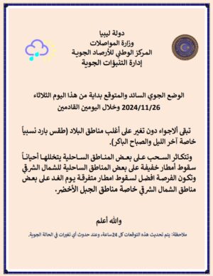 وأشار في نشرته الجوية اليوم الثلاثاء، إلى تكاثر السحب على بعض المناطق الساحلية، يتخللها أحياناً سقوط أمطار خفيفة على بعض المناطق الساحلية للشمال الشرقي، وتكون الفرصة أفضل لسقوط أمطار متفرقة يوم الغد على بعض مناطق الشمال الشرقي خاصة مناطق الجبل الأخضر.