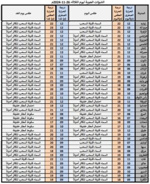 حالة السماء: تتكاثر السحب من حين لآخر قد يتخللها سقوط أمطار خفيفة على بعض المناطق الساحلية ومرتفعات الجبل الأخضر، وتكون فرصة الأمطار أفضل يوم الغد.