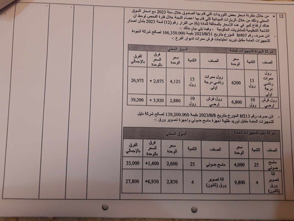 كما رصد التقرير أيضًا شراء مكيفات بأسعار مضاعفة عن القيمة الحقيقية لها، موضحًا أن هذه الممارسات تشير إلى وجود فساد في العقود والمشتريات الحكومية وعدم وجود رقابة فعالة على الإنفاق.