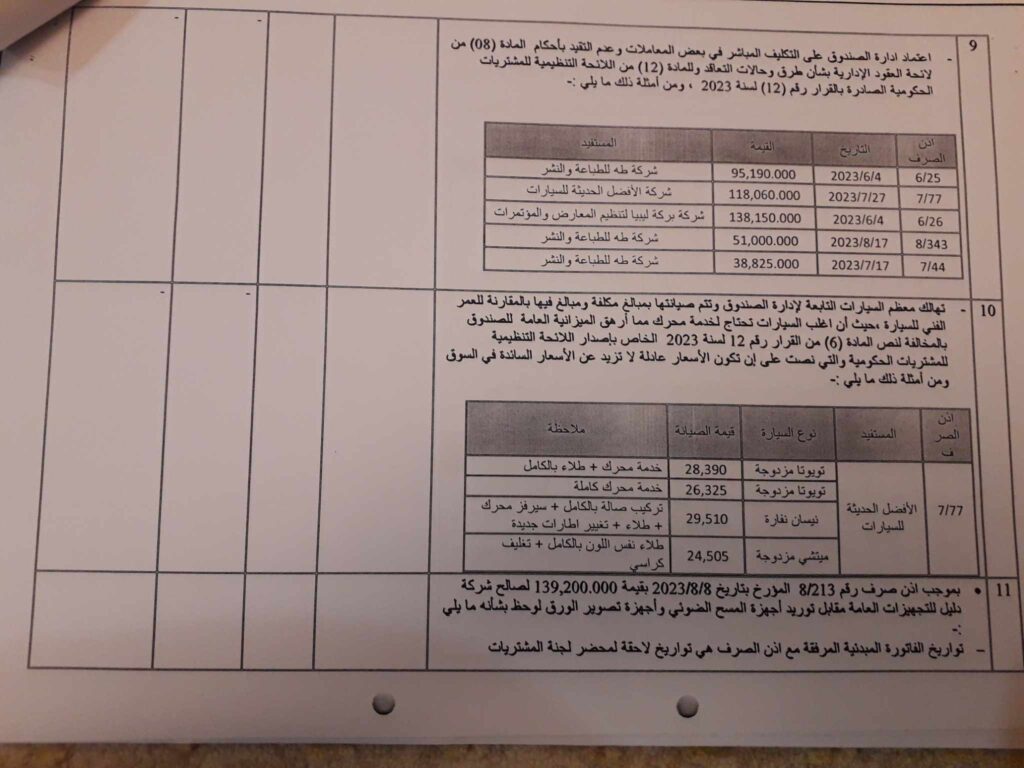 التقرير رصد إهدار المال العام في تصليح السيارات والشراء المبالغ فيه للمكيفات، ووفقًا للتقرير تم إنفاق أموال مبالغ فيها على تصليح سيارات بأسعار تصل إلى أسعار السيارات الجديدة.