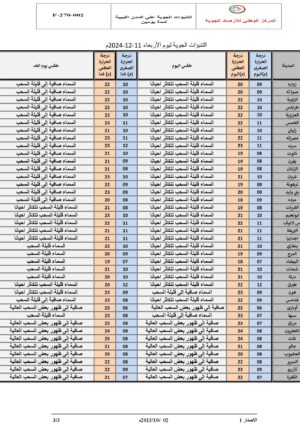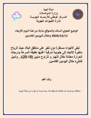 أفاد مركز الأرصاد الجوية باستمرار اعتدال درجات الحرارة خلال فترة النهار نسبياً على أغلب مناطق ليبيا، وتتراوح ما بين 17-25مْ.