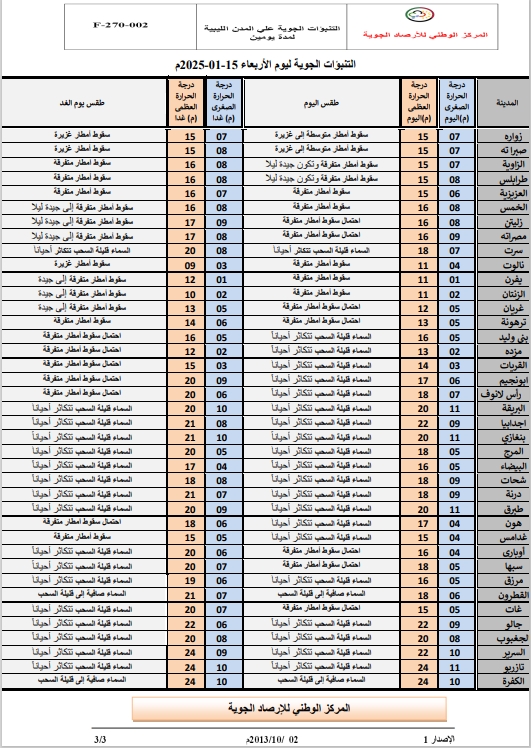 حالة السماء: قليلة السحب تتكاثر أحياناً مع احتمال سقوط أمطار متفرقة مساء اليوم على غات- سبها- أوباري، وتشمل الفرصة يوم الغد مناطق هون- غدامس وجنوبها – الحمادة.