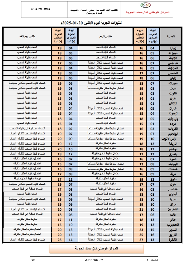 حالة السماء: قليلة السحب تتكاثر أحيانا مع سقوط أمطار متفرقة على مناطق مراده وما جاورها- زلة – الواحات.