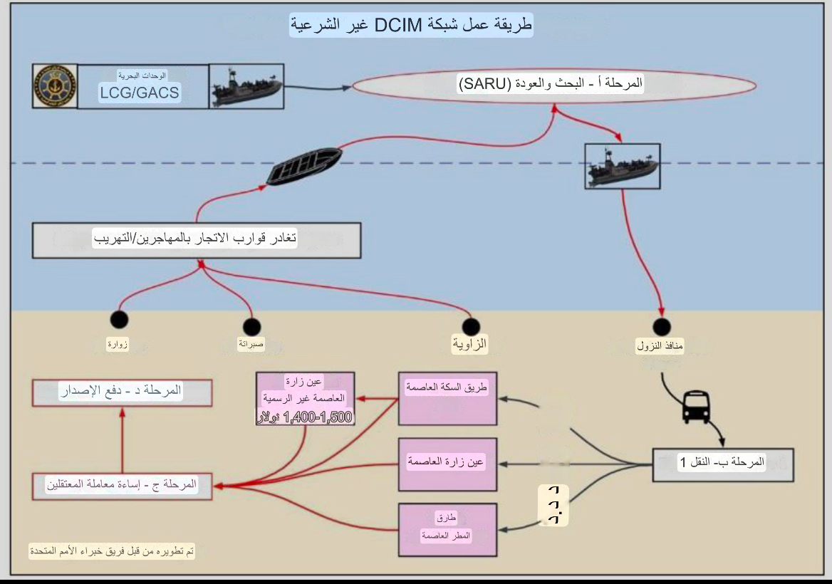 2. نقلهم من نقاط الوصول في ليبيا إلى مراكز احتجاز يديرها جهاز مكافحة الهجرة غير الشرعية.