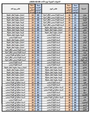 توقع مركز الأرصاد الجوية أن تسود البلاد، أجواء باردة نسبيا، حيث تتراوح درجات الحرارة القصوى ما بين 12- 19مْ على أغلب المناطق، مع تكاثر للسحب من حين لآخر على بعض مناطق الشمال.
