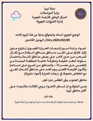 وأشار المركز في نشرته الجوية اليوم الأحد، إلى احتمالية سقوط أمطار خفيفة ومتفرقة خاصة المنطقة الممتدة من الخمس حتى مصراتة والمناطق من المرج حتى امساعد.