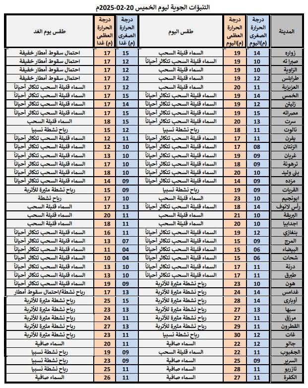 الرياح :شمالية غربية إلى شمالية شرقية معتدلة السرعة، تتحول يوم الغد إلى شرقية فجنوبية شرقية نشطة السرعة خاصة على غدامس والحمادة مثيرة للأتربة والرمال وتشمل يوم الجمعة اغلب المناطق.