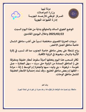 أفاد مركز الأرصاد الجوية بانخفاض نسبي في درجات الحرارة على مناطق الشمال خاصة مناطق الجبل الأخضر، ورياح نشطة على بعض مناطق الجنوب مثيرة للأتربة والرمال.