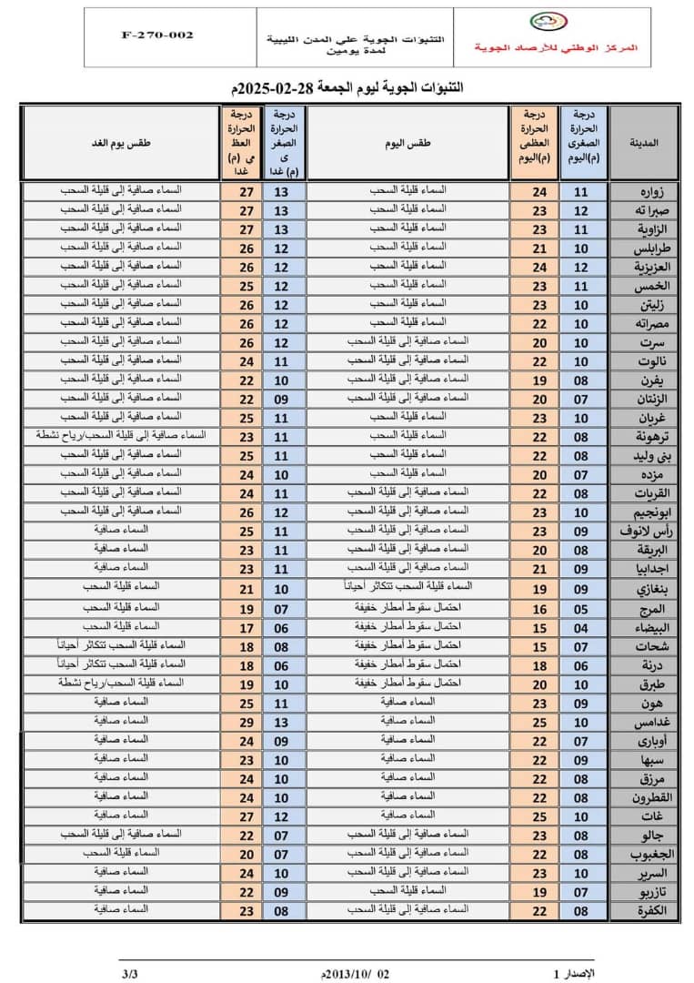 كشف مركز الأرصاد الجوية، تفاصيل حالة الطقس المتوقعة على ليبيا خلال الأيام الثلاثة القادمة ابتداء من اليوم الجمعة 28-02-2025م