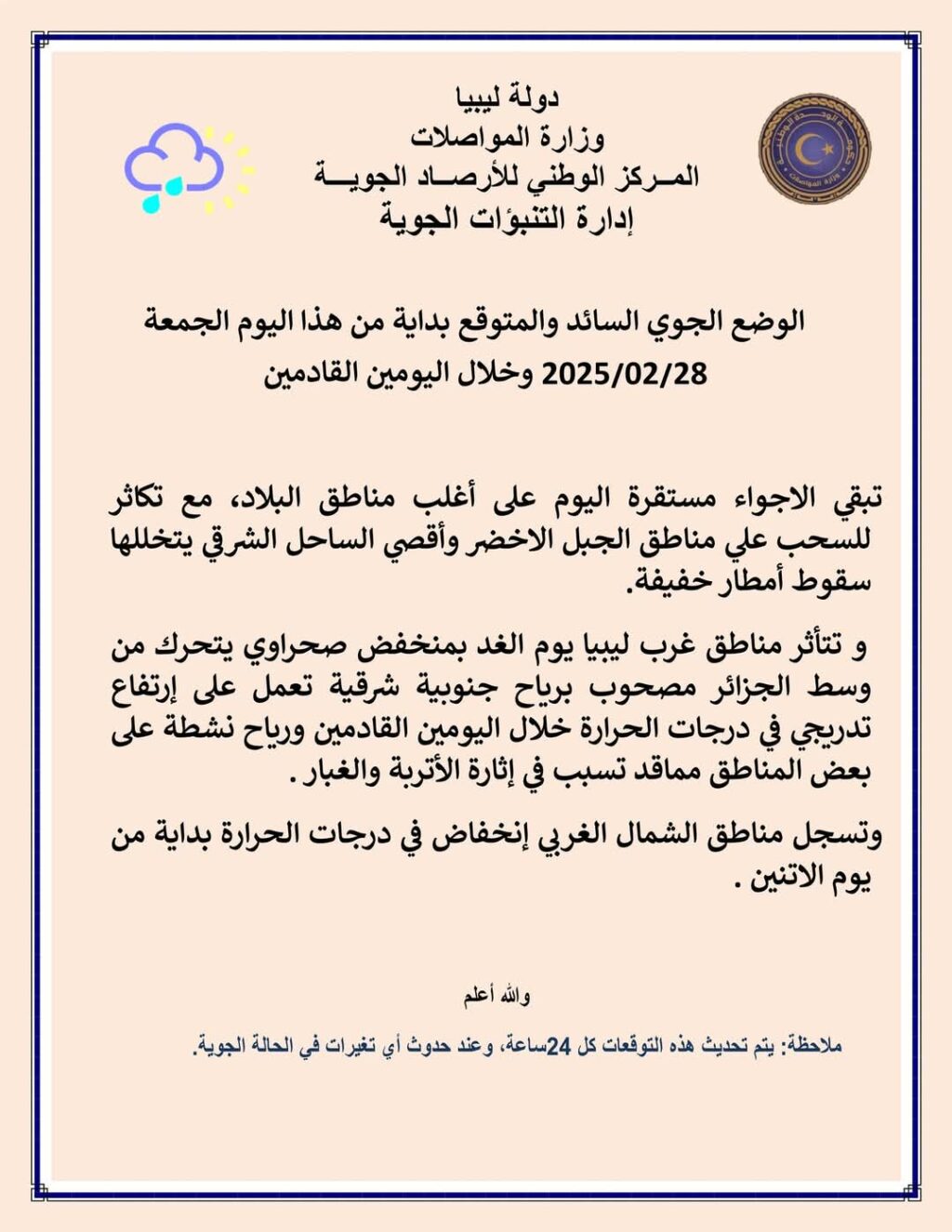 كشف مركز الأرصاد الجوية، تفاصيل حالة الطقس المتوقعة على ليبيا خلال الأيام الثلاثة القادمة ابتداء من اليوم الجمعة 28-02-2025م