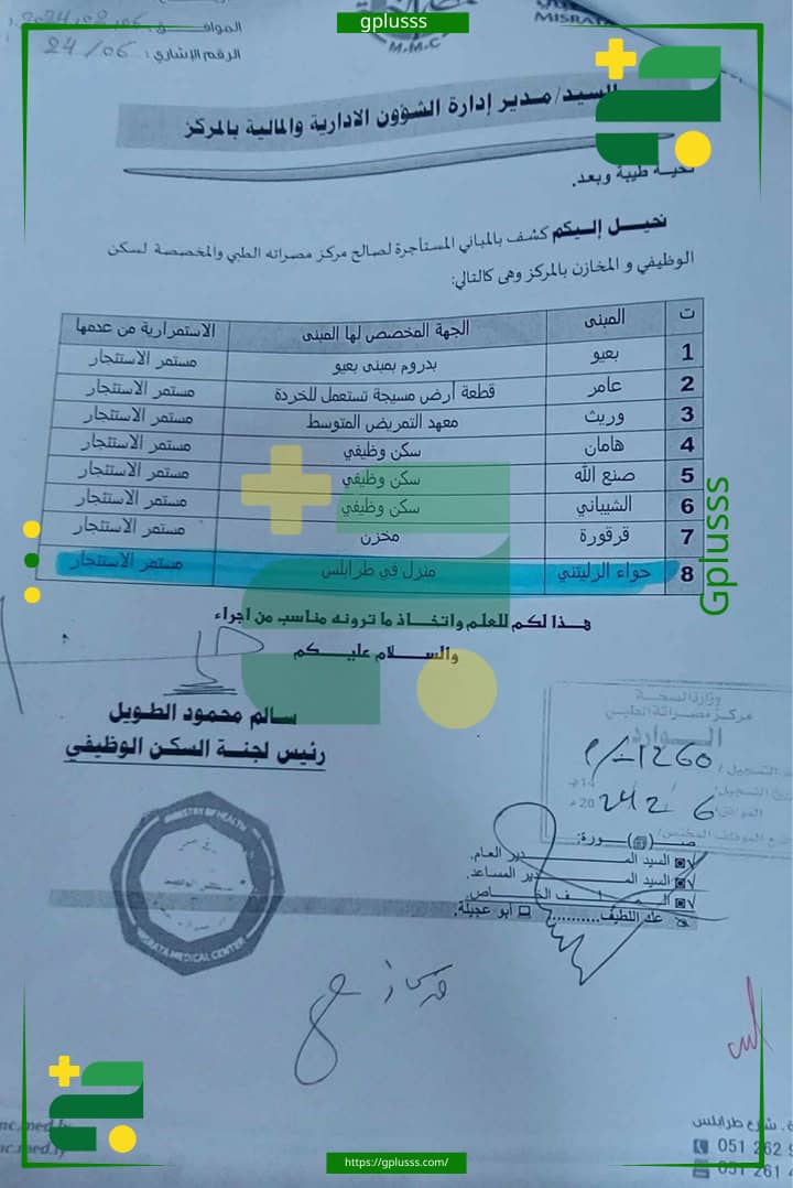 وتحصلت “ج بلس”، على خطاب رسمي مراسل من رئيس لجنة السكن الوظيفي في مركز مصراتة الطبي إلى مدير إدارة الشؤون الإدارية والمالية بالمركز، يتضمن كشفًا بالمباني المستأجرة لصالح المركز والمخصصة للسكن الوظيفي والمخازن، بتاريخ 2024/06/14 من الرقم الإشاري 106-24.