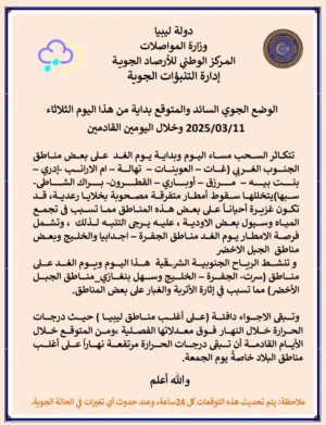 يتخللها سقوط أمطار متفرقة مصحوبة بخلايا رعدية، قد تكون غزيرة أحياناً على بعض هذه المناطق، مما يتسبب في تجمع المياه وسيول بعض الأودية، وتشمل فرصة الأمطار يوم الغد مناطق الجفرة وإجدابيا والخليج وبعض مناطق الجبل الأخضر.