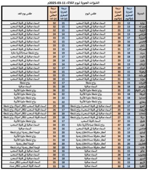 درجات الحرارة القصوى: تتراوح ما بين 28– 31مْ، وتسجل ارتفاعا تدريجيا وطفيفا اليومين القادمين على أغلب المناطق.