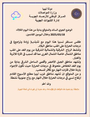 توقع مركز الأرصاد الجوية استقرار حالة الطقس اليوم الثلاثاء، على أغلب مناطق البلاد، مع نشاط رياح غدا على أغلب مناطق الشمال، وانخفاض ملحوظ في درجات الحرارة على الجبل الأخضر وأقصى الساحل الشرقي.