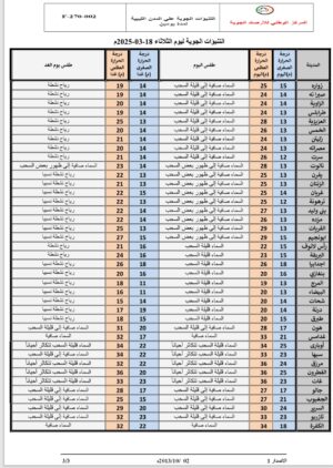 درجات الحرارة القصوى: تتراوح على أغلب المناطق ما بين 19- 26مْ وتسجل انخفاضا تدريجيا من يوم الغد ويكون ملحوظا على مناطق الجبل الأخضر وأقصى الساحل الشرقي.