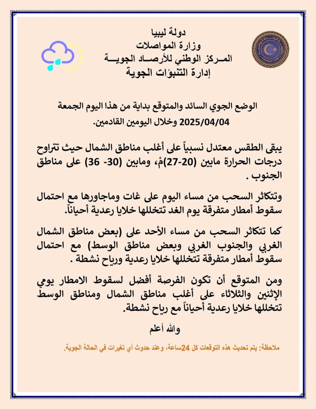 وأكد المركز في نشرته الجوية اليوم الجمعة، أن السحب تتكاثر من مساء اليوم على غات وما جاورها مع احتمال سقوط أمطار متفرقة يوم الغد تتخللها خلايا رعدية أحياناً.
