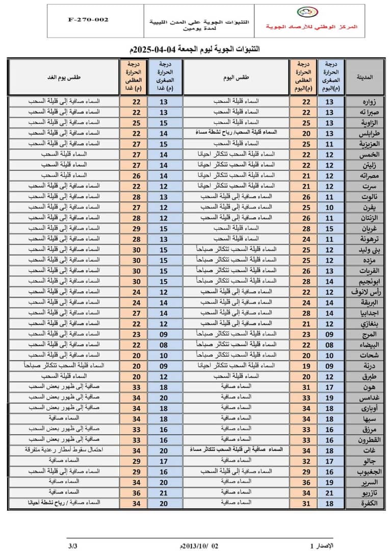 أفاد مركز الأرصاد الجوية، بأنه من المتوقع أن يبقى الطقس معتدل نسبياً على أغلب مناطق الشمال حيث تتراوح درجات الحرارة مابين (20-27)مْ، ومابين (30- 36) على مناطق الجنوب .
