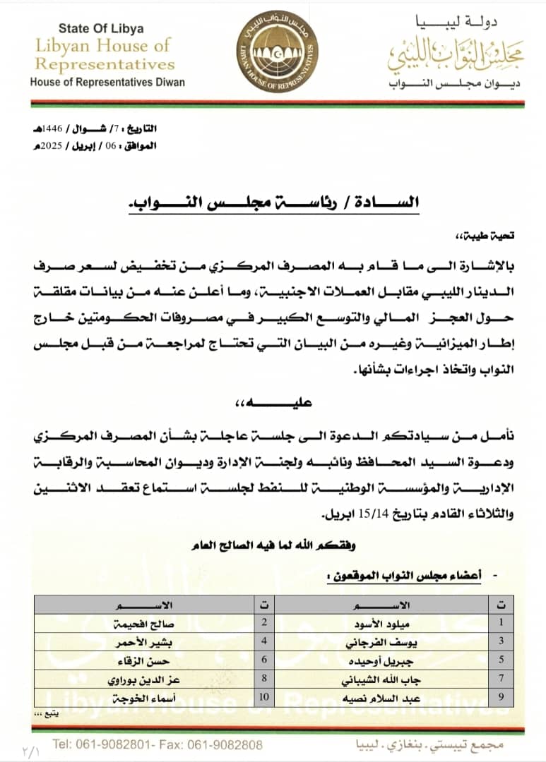 طالب عدد من أعضاء مجلس النواب في رسالة رسمية موجهة لرئاسة المجلس بعقد جلسة عاجلة لمناقشة القرارات الأخيرة التي اتخذها المصرف المركزي بشأن تخفيض سعر صرف الدينار، بالإضافة إلى ما ورد في بيانات المصرف من مؤشرات مقلقة حول العجز المالي والتوسع الكبير في الإنفاق الحكومي خارج إطار الميزانية المعتمدة.