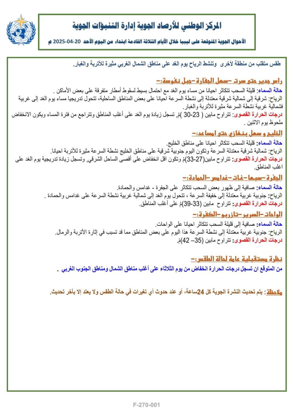 تكون السماء صافية إلى ظهور بعض السحب، خاصة على مناطق الجفرة وغدامس والحمادة. الرياح جنوبية غربية خفيفة إلى معتدلة، تتحول يوم الغد إلى شمالية غربية نشطة على غدامس والحمادة. تتراوح درجات الحرارة القصوى ما بين (33-39) مئوية.
