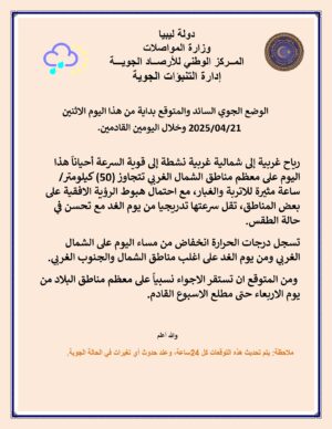 الرياح: شمالية غربية إلى شمالية معتدلة السرعة وتكون جنوبية غربية إلى غربية على أقصى الجنوب، تنشط اليوم على غدامس والحمادة.