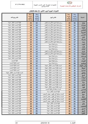 درجات الحرارة القصوى: تتراوح على المناطق من راس جدير إلى طرابلس ما بين 24-27مْ، وما بين 29-35مْ على باقي المناطق وتسجل انخفاضا من مساء اليوم ويكون ملحوظا يوم الغد.
