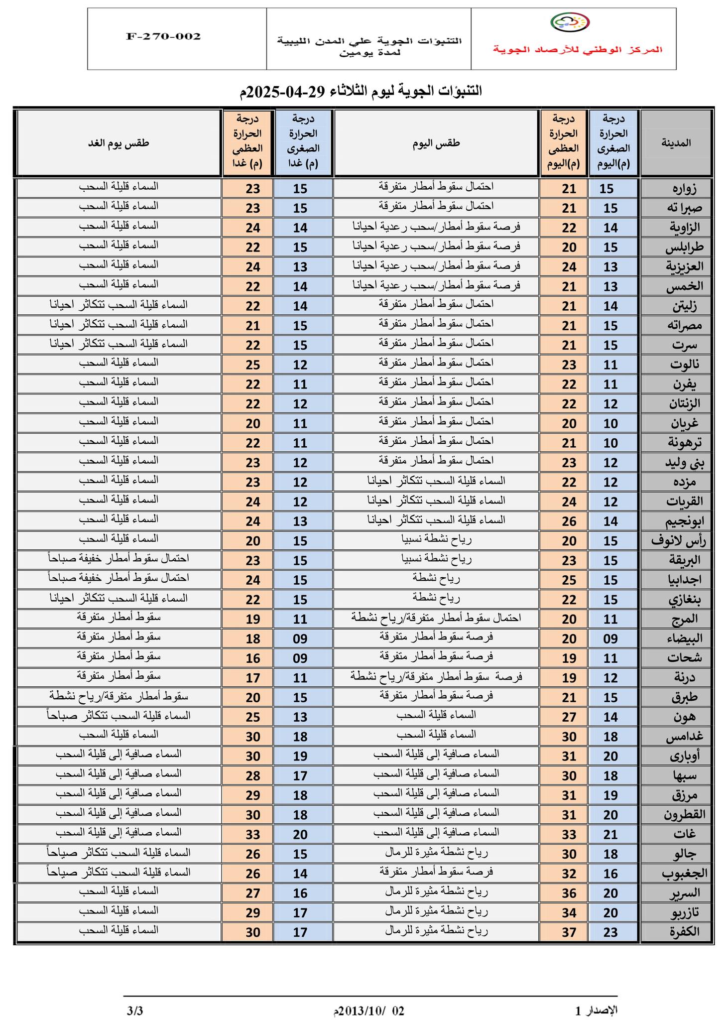 حالة السماء: قليلة السحب تتكاثر من حين إلى آخر يتخللها سقوط أمطار متفرقة خاصة على المناطق الممتدة من المرج إلى أقصى الساحل الشرقي يصحبها خلايا رعدية أحياناً.