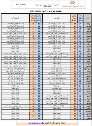 وأوضح المركز في نشرته الجوية اليوم الأربعاء، أن الحرارة القصوى على الجنوب تتراوح ما بين 37–41مْ، وتسجل تراجعا خلال اليومين القادمين على معظم المناطق الجنوبية.