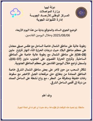 الرياح: شمالية غربية إلى شمالية معتدلة السرعة تنشط على الساحل الممتد من درنة حتى امساعد.