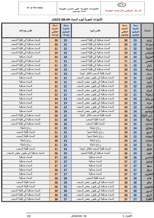 وبحسب النشرة الجوية الصادرة عن إدارة التنبؤات الجوية، اليوم السبت، ستشهد المناطق الممتدة من رأس جدير حتى سرت، بما في ذلك سهل الجفارة وجبل نفوسة، سماءً صافية إلى قليلة السحب، مع رياح شمالية إلى متغيرة الاتجاه معتدلة إلى خفيفة السرعة.