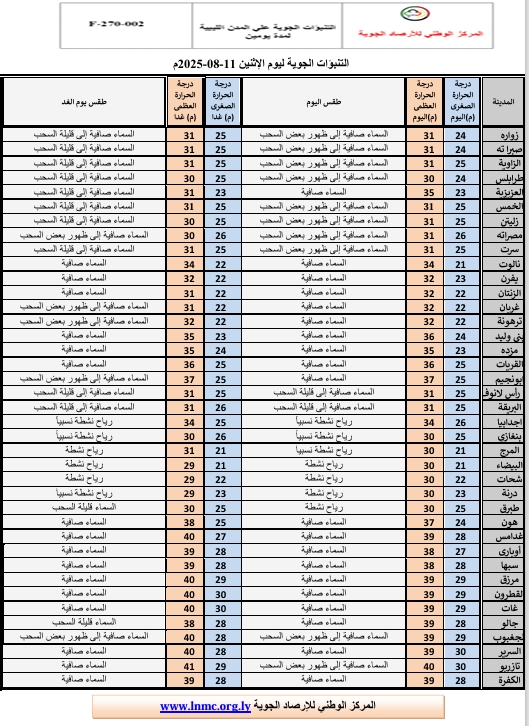 وتوقع المركز في نشرته الجوية اليوم الاثنين، نشاط الرياح الشمالية الغربية هذا اليوم على الساحل الشرقي خاصة الممتد من درنة إلى أقصى الساحل الشرقي تصل إلى 50 كيلومتر/ الساعة، مما قد تسبب في إثارة الأتربة.