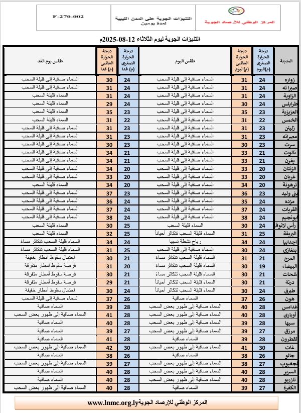 أفاد مركز الأرصاد الجوية ببقاء الأجواء صيفية مستقرة على كامل مناطق البلاد، حيث درجات الحرارة ضمن معدلاتها لهذا الشهر وتتراوح ما بين 30-36مْ على مناطق الشمال، وما بين 37-41مْ على الجنوب مع رطوبة عالية نسبياً على المناطق الساحلية.