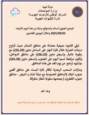 حالة السماء: قليلة السحب، تتكاثر السحب الرعدية على المناطق الحدودية مع دولة النيجر يصحبها سقوط أمطار متفرقة، وكذلك تتكاثر الخلايا الرعدية اليوم ويوم الغد على غدامس وسبها وغات.