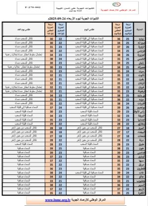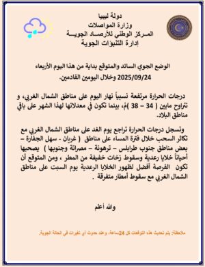 وأوضح المركز في نشرته الجوية، الأربعاء، أن درجات الحرارة تسجل تراجعا غدا على مناطق الشمال الغربي مع تكاثر السحب خلال فترة المساء على مناطق غريان وسهل الجفارة وبعض مناطق جنوب طرابلس وترهونة ومصراتة وجنوبها، يصحبها أحياناً خلايا رعدية وسقوط زخات خفيفة من المطر.