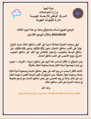 وتوقع المركز في نشرته الجوية اليوم الثلاثاء، أن تتكاثر السحب هذا اليوم على مناطق مزدة– القريات– جنوب بني وليد، يصحبها أحياناً خلايا رعدية وسقوط أمطار متفرقة.