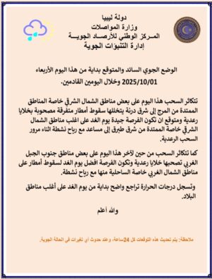 أفاد مركز الأرصاد الجوية بتكاثر السحب اليوم على بعض مناطق الشمال الشرقي، خاصة الممتدة من المرج إلى شرق درنة، يتخللها سقوط أمطار متفرقة مصحوبة بخلايا رعدية.