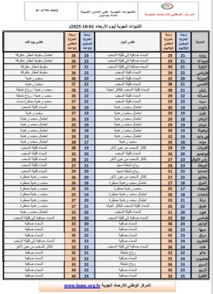 درجات الحرارة القصوى: تتراوح ما بين 32-36مْ، وتسجل انخفاضا من يوم الغد على أغلب المناطق.