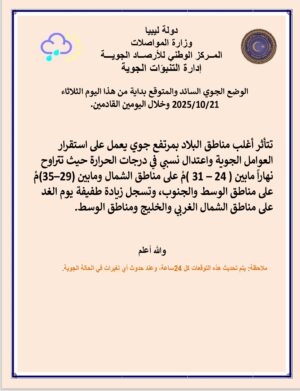 درجات الحرارة القصوى: تتراوح ما بين 29-33م، وتسجل زيادة طفيفة يوم الغد على غدامس والحمادة ومناطق الجفرة.
