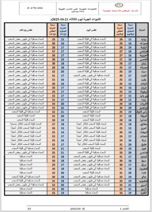 درجات الحرارة القصوى: تتراوح ما بين 25-30م، وتسجل زيادة طفيفة يوم الغد.