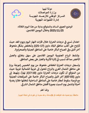 الرياح: جنوبية شرقية إلى جنوبية غربية معتدلة السرعة، تنشط اليومين القادمين على سهل بنغازي والجبل الأخضر مما قد تسبب في إثارة الأتربة والغبار على بعض المناطق.