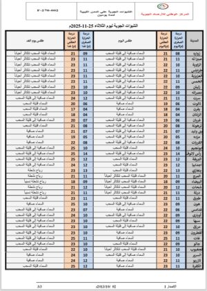 درجات الحرارة القصوى: تتراوح ما بين 21-23مْ، وتسجل زيادة تدريجية وطفيفة اليومين القادمين.