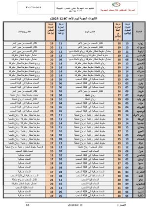 وأضاف المركز أن أجواء الجفرة وسبها وغات وغدامس والحمادة ستكون مستقرة نسبيًا مع سحب قليلة ورياح شمالية غربية معتدلة، ودرجات حرارة تتراوح بين 15 و19 درجة مئوية.
