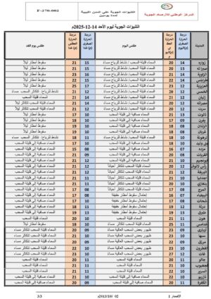 ولفت إلى أن الرياح ستكون شمالية شرقية خفيفة إلى معتدلة السرعة، بينما تتراوح درجات الحرارة القصوى ما بين 16 و21 درجة مئوية.