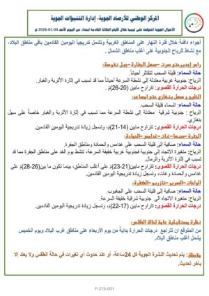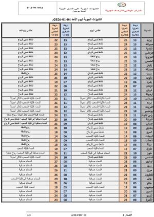 أكد مركز الأرصاد الجوية أن الأحوال الجوية المتوقعة على ليبيا خلال الأيام الثلاثة القادمة، ابتداءً من اليوم الأحد 04-01-2026، تشير إلى أجواء دافئة خلال فترة النهار على المناطق الغربية، وتشمل تدريجيًا خلال اليومين القادمين باقي مناطق البلاد، مع نشاط للرياح الجنوبية على أغلب مناطق الشمال.