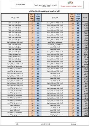وختم المركز نظرته المستقبلية بالتنويه إلى توقع نشاط الرياح مساء الأحد القادم على مناطق شمال ووسط البلاد، مما قد يسبب إثارة للأتربة والغبار.
