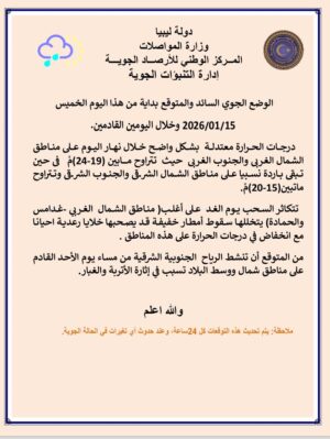وأضاف المركز أن مناطق الخليج وسهل بنغازي حتى امساعد ستشهد سماء قليلة السحب تتكاثر على بعض مناطق الجبل الأخضر، مع درجات حرارة تتراوح بين (15-19) مْ.