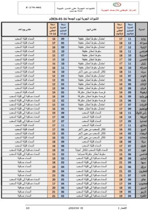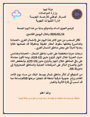 كما ستكون الرياح جنوبية غربية إلى شمالية غربية خفيفة إلى معتدلة تتحول يوم الأحد إلى جنوبية شرقية معتدلة إلى نشطة السرعة، فيما تتراوح درجات الحرارة القصوى بين 20 و23 مْ، ولا تتجاوز 15 مْ على غدامس والحمادة.