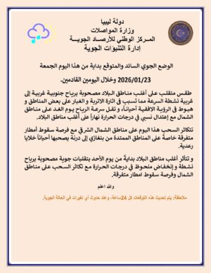 وأفاد المركز بتكاثر السحب اليوم على مناطق الشمال الشرقي مع فرصة سقوط أمطار متفرقة خاصة على المناطق الممتدة من بنغازي إلى درنة، قد يصحبها أحيانًا خلايا رعدية.