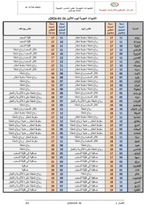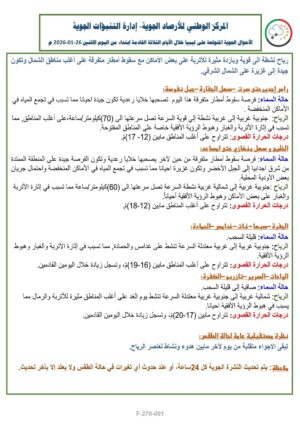 وأضاف في نشرته الجوية اليوم الإثنين، أن مناطق رأس اجدير حتى سرت وسهل الجفارة وجبل نفوسة ستشهد أمطاراً متفرقة هذا اليوم تصحبها خلايا رعدية قد تؤدي إلى تجمع المياه في الأماكن المنخفضة، مع رياح جنوبية غربية إلى غربية نشطة إلى قوية تصل سرعتها إلى 70 كم/ساعة وتسبب هبوطاً في الرؤية الأفقية، فيما تتراوح درجات الحرارة القصوى بين 12 و17 م°.